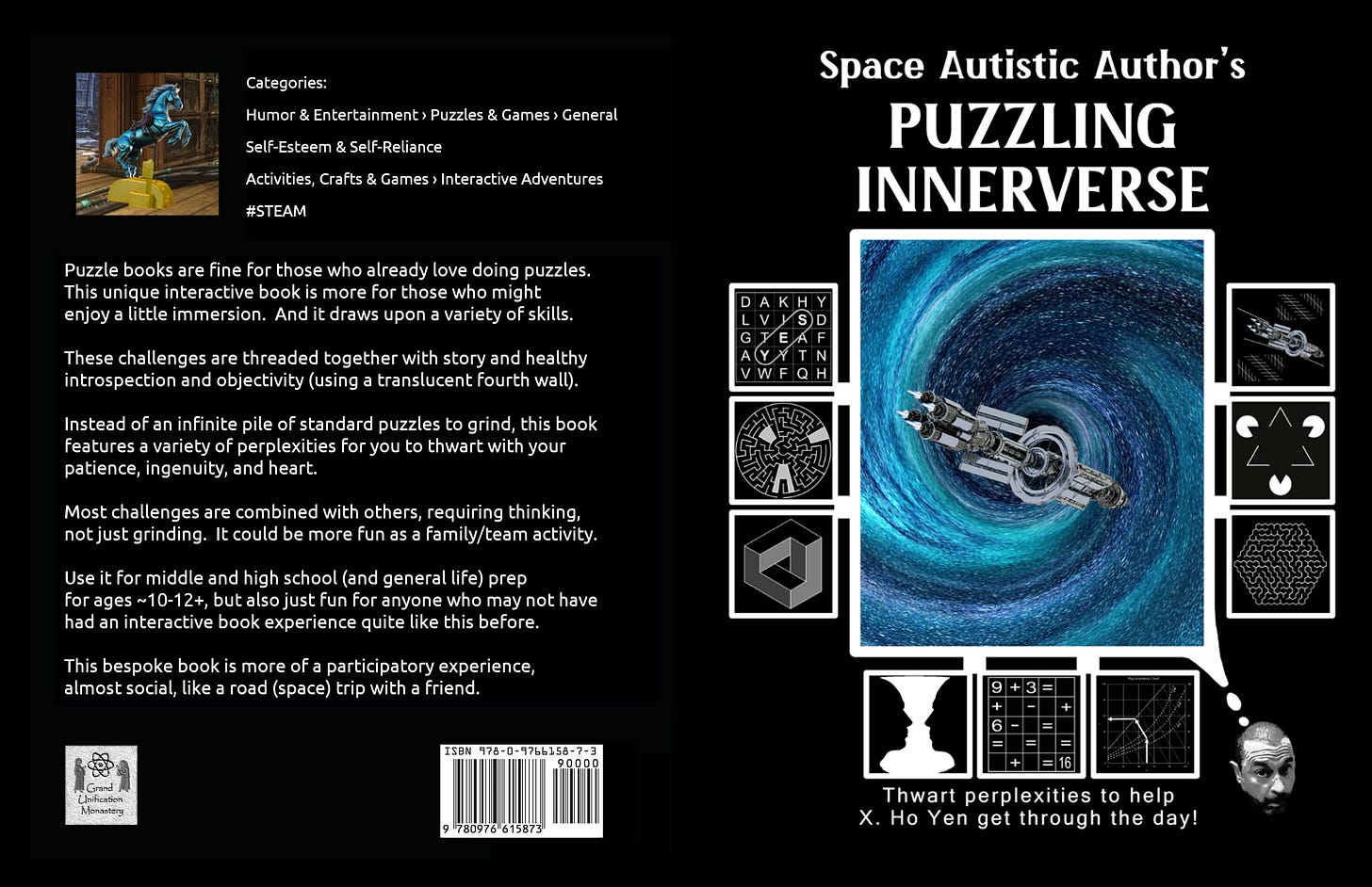 The reader is immersed in X.’s world, which looks like X. flying through space in the “Endoprise” along with the various embodied voices in his head. (This is an extension of the Innerverse of my cross-promo youtube video series for adults, “Space Autistic Author”.) It can be bizarre, funny, and scary in there. Each challenge is a representation of one of X.’s challenges in his Innerverse. This is stated openly. The fourth wall is translucent here, which is a mechanism for facing introspection, objectivity, and emotional health.