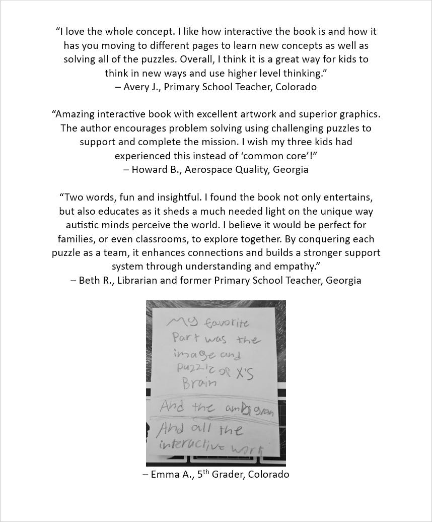 I could have made this book longer. I could have filled it with more puzzles. But this structure and length felt organically correct. Unlike with a ‘puzzle book’, with something like this you don’t actually want to feel like it’s endless. You participate in the story, you put your hours into actually doing the sometimes complex tasks, you feel the satisfaction of not only getting past fear and of learning, but of helping. And then X.’s day is done, and you helped make it happen. You helped bring completion and closure to the day’s challenges. It feels good, not burdensome. That, too, is intentional.